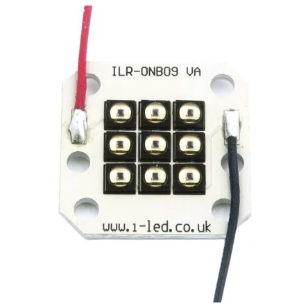 Depending on the mode of operation, these devices emit highly concentrated non-visible infrared light which can be hazardous to the human eye. PowerCluster IR LED arrays will overheat in operation if not attached to a suitable heat sink, over heating can cause failure or irreparable damage. Do not operate PowerCluster LED arrays with a power supply with unlimited current. Connection to constant voltage power supplies that are not current limited may cause the PowerCluster LED array to consume current above the specified maximum and cause failure or irreparable damage. PowerCluster IR LED Arrays - IR OSLON Black 9. The Oslon 9 PowerCluster IR series of infrared LED arrays, from Intelligent LED solutions, feature 9 Osram Oslon Black IR LEDs. Powerful and compact PowerCluster IR LED arrays are built on aluminium substrates for optimal thermal management and come pre-wired with 200mm wires as standard. Oslon 9 PowerCluster IR LED arrays are ideal for a wide range of applications including: surveillance systems, IR illumination for cameras, machine vision, night vision light and driver assistance systems. Oslon 9 PowerCluster IR LED arrays contain 9 Osram IR Oslon Black series LEDs Current range: 100 to 1,000mA Lifetime: Up to 100,000 hours to 70% of original brightness Mounting holes for M3 screws allow easy installation PowerCluster size (L x W x H): 25mm x 25mm x 3.85mm Pre-wired with 200mm connecting wires PowerClusters can be linked together to produce longer chains See datasheet for suitable heat sinks, constant current LED drivers and thermal interface material