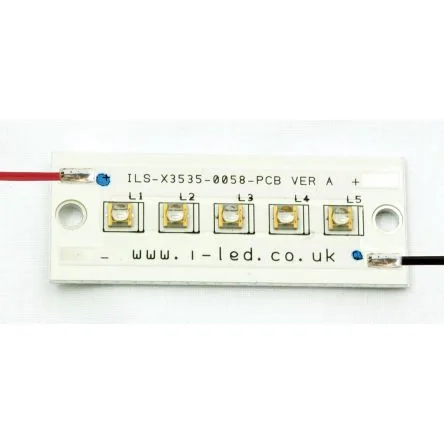 Intelligent LED Solutions 3535 PowerLinear UV LED Strips. This family of UV PowerLinear strips from Intelligent LED Solutions (ILS), houses 3535 UV LEDs from TSLC. These compact UV LEDs offer a high quality light output and are very reliable. They are compact with a 55° or 125° lens. PowerLinear series LED arrays consist of a vertical chip structure on an aluminium substrate. They offer high thermal conductivity from a compact and powerful light source. Suitable applications for the 3535 PowerLinear strips include; polymer curing, ink curing, counterfeit detection, aquarium lighting, medical/DNA sequencing and inspection equipment.. Features of the 3535 PowerLinear UV strips: 5 or 6 3535 UV LEDs Dimensions: 20 x 20 x 2 mm Comes with 200 mm connecting wires Can be linked together for longer chains Current: up to 800 mA