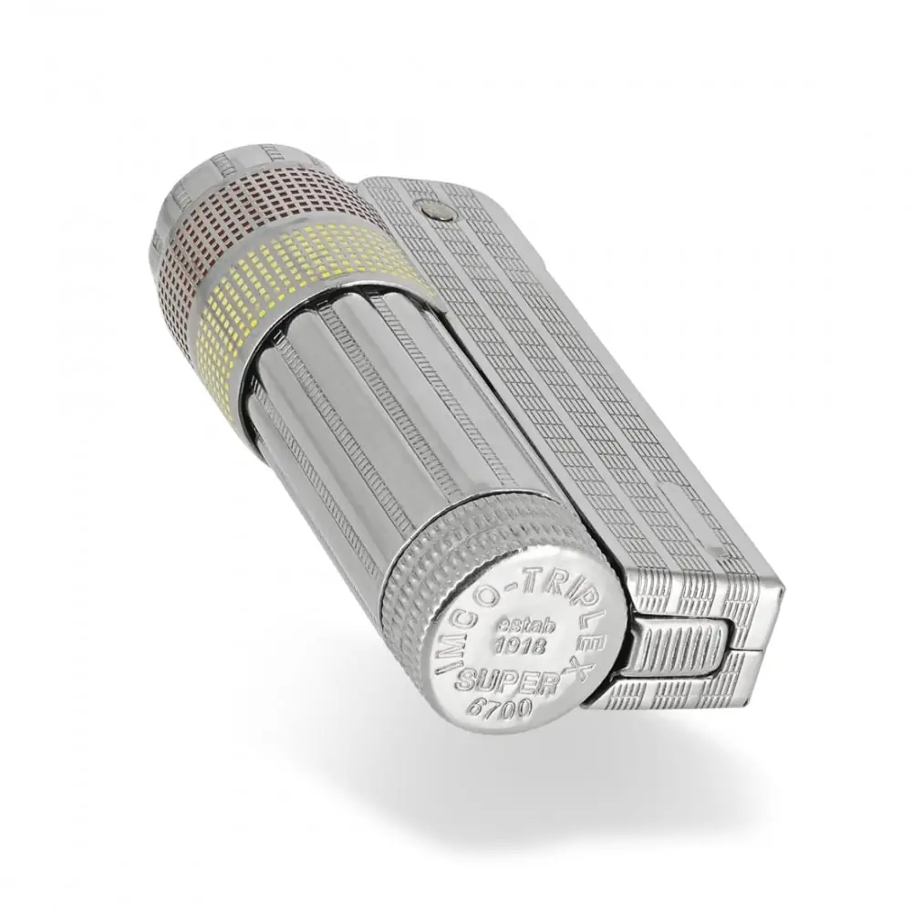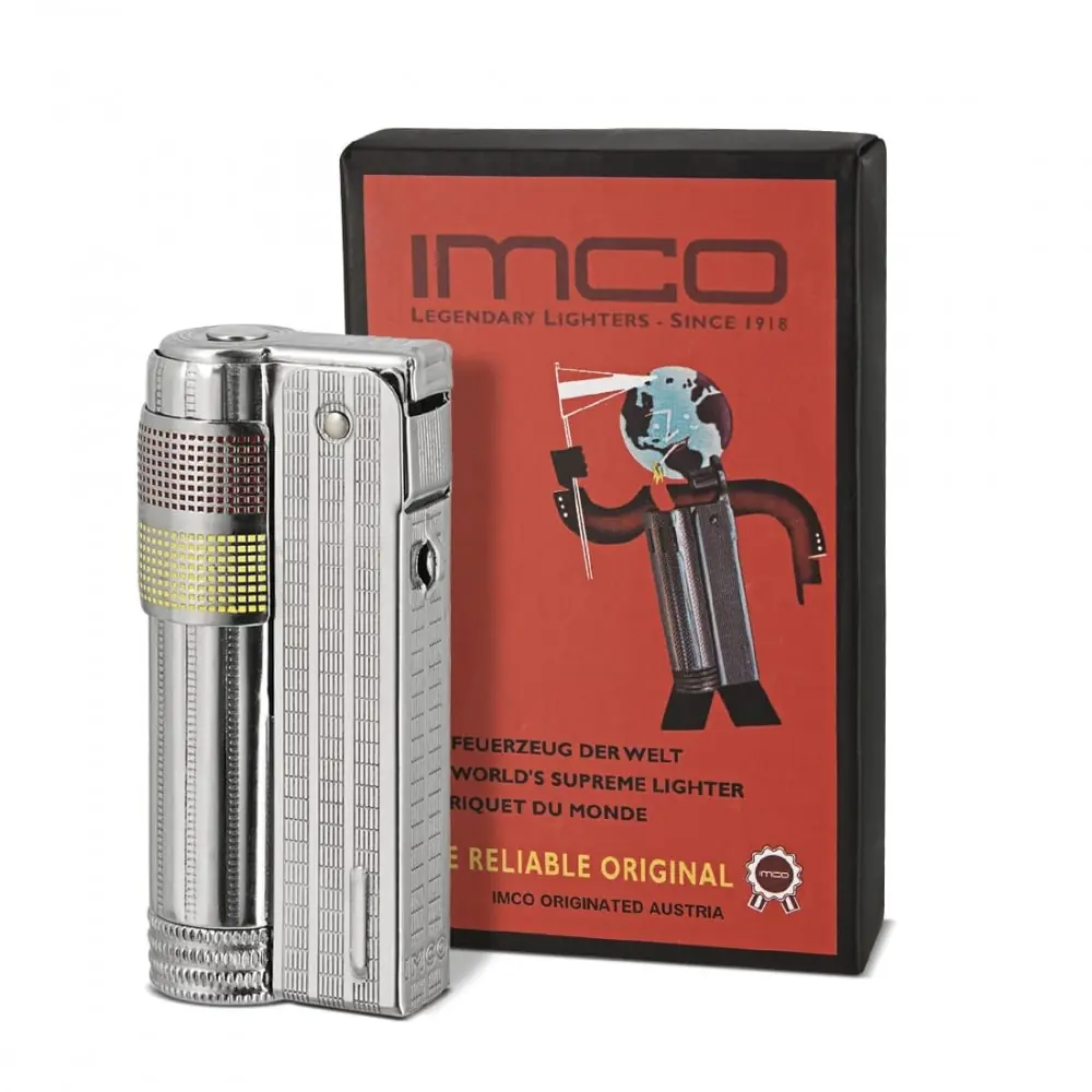 discover the imco super triplex chrome yellow red lighter a reliable and elegant lighter for your daily lighting needs. featuring a shiny chrome finish with yellow and red accents this lighter offers an adjustable flame and wind resistance for optimal outdoor use. lightweight and easy to handle it is perfect for smokers and outdoor enthusiasts.