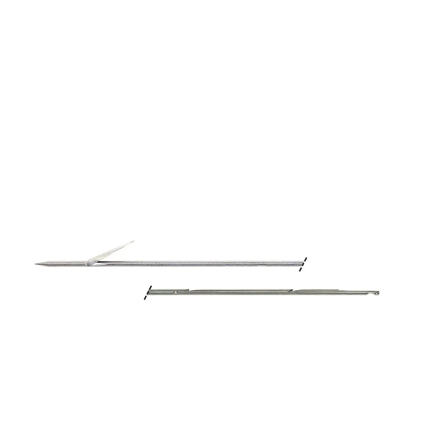 The Imersion Tahitian Arrow is a high-quality speargun shaft designed for precision underwater hunting. Crafted from stainless steel with a diameter of 6 mm, it offers exceptional durability and resistance, with a tensile strength of 180 Kgs/mm². The arrow features a single Tahitian barb with an opening on top, enhancing its effectiveness in capturing prey. It includes two notches for secure attachment to the speargun's metal shaft, ensuring stability during use. The milled heel design contributes to improved aerodynamics and accuracy. This arrow is compatible with all underwater hunting crossbows and is 100% made in France.