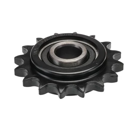 INA roller chain idler sprocket units are guidance and return units for roller bush chains and roller chains. They can compensate for chain stretch resulting from operation and give smoother system running under high loads and speeds The ready-to-fit units comprise sprockets and deep groove ball bearings or radial insert ball bearings. The sprockets are made from high strength steel, sintered iron or plastic (polyamide). Sprockets made from plastic give particularly smooth running and generate very little noise. Since the inner ring of the deep groove ball bearing is extended on both sides, no additional spacer rings are required In series KSR.-B0, the inner ring is located on the shaft by means of a locking collar. The bearing bore of this series has a plus tolerance.