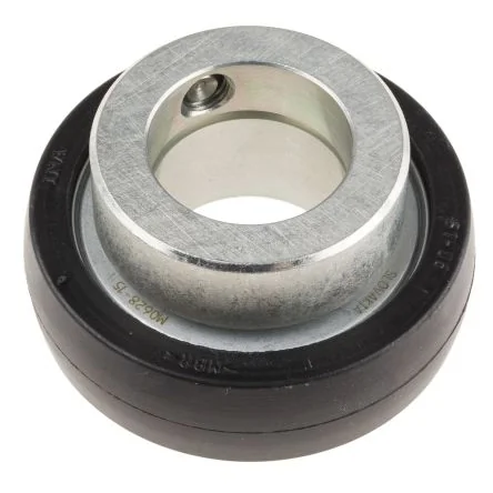 Radial Insert Ball Bearings with Rubber Interliner. INA from Schaeffler radial insert ball bearings with rubber interliners are on the shaft using an eccentric locking collar. The outer ring is encased in a thick-walled NBR interliner which absorbs vibrations and shocks. The interliners have either a spherical or cylindrical outside surface. The P seal is two zinc-coated sheet steel washers with intermediate NBR part, seal lip axially preloaded. To protect the seal lip from mechanical damage, the outer sheet steel washer extends a considerable distance down towards the bearing inner ring. Used in narrow radial insert ball bearings with inner ring extended on one side. Features and Benefits. • Lower operating costs. • Reduced maintenance due to improved lubrication. • Lower heat generation. • Less noise. • Inner ring and locking collar have anti-corrosion protection. • Shaft diameters from 12 mm to 50 mm (RABRB). • Shaft diameters 20 mm (RCRA) 25 mm (RCRB). • Shaft diameters 30 mm (RCSMA) 15 mm to 25 mm (RCSMB). Product Application Information. Bearings with rubber interliners cannot be lubricated. Suffixes. FA106 - Bearing subjected to special noise testing