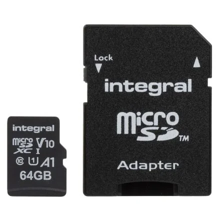 Integral Memory MicroSDXC Micro SD CardThe Integral Memory SDXC SD card is a 64GB card perfect fit for smartphones and tablets. It provides more space for storing apps photos music and videos. It also allows fast data transfer and reliable photography on a compatible device. The card provides full HD recording as well.Features and Benefits• 9-pin interface • Fast 100MB/s transfer speed • SD adapter included • Temperature ranges between -25°C and 70°CApplications• Action cams • Digital cameras • Drones • Game consoles • Smartphones • TabletsCertifications• UHS-1 rated