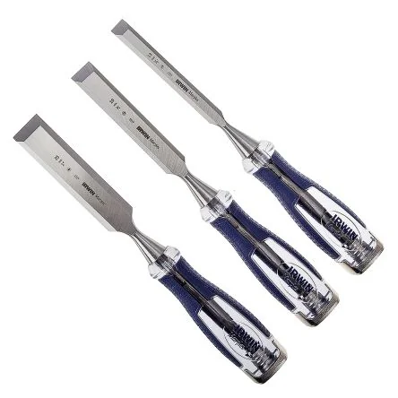 3 Piece High Impact Chisel Set (1/2in, 3/4in, 1in) 5 Piece High Impact Chisel Wallet (1/4in, 1/2in, 3/4in, 1in, 1-1/4in). IRWIN MS750 High-Impact Chisel Sets. Introducing the heavy-duty set of Professional High-Impact Chisels MS750 from IRWIN. These chisels are all-purpose bevel-edge chisel that also features an upgraded hardened and tempered high carbon steel blade to make jobs like carving out a recess for a hinge or strike plate, easy and accurate. With its IRWIN patented ProTouch grip, these construction chisels are comfortable to hold and its oversized steel strike caps can withstand heavy, repetitive iron-hammer strikes. Also, the acetate split-proof handle is designed to absorb vibrations and reducing hand fatigue. IRWIN MS750 Chisel sets are available in two options: 3 Pieces Set: ; 879-2996 879-2996 5 Pieces Set: ; 879-2990 879-2990. Features and Benefits:. Ergonomic soft ProTouch Grip handle for comfort, precise control and durable enough to withstand heavy-duty job site applications Fully Forged Steel Core for superior durability and increased performance High-Carbon Steel Blade for extra durability and edge retention Split-Proof acetate handle for reinforced toughness Large steel strike cap withstands repetitive, heavy hammer strikes Pre-sharpened blade – ready for immediate use Specifically made for intensive use Available as 3 or 5 pieces sets. Typical Applications:. Chisels are tools designed for cutting or curving hard materials such as concrete, metal stone or wood. Chisels can be made chrome vanadium steel, forged steel, hardened steel, HCS, vanadium steel etc. according to their specific uses. They are commonly used in: Woodworking Metalworking Stoneworking Precision cutting Demolition. FAQs:. ;i>Are these chisels hardened? ;/i> Yes, this excellent quality chisels have been forged for increased safety of use and long life operation. ;i>Do you stock stones for sharpening chisels? ;/i> Yes, we do stock ;a href="/web/c/abrasives-engineering-materials/manual-sanding-sharpening/sharpening-stones/">Sharpening Stones ;/a> that can be used for many applications, including sharpening chisels. ;i>What sizes are included in the set? ;/i> The 3 Pieces Set ( ; 879-2996 879-2996 ) includes 1 in, 1/2 in, 3/4 in chisels. The 5 Pieces Set ( ; 879-2990 879-2990 ) includes 1 in, 1/2 in, 1/4 in, 3/4 in, 3/8 in chisels.