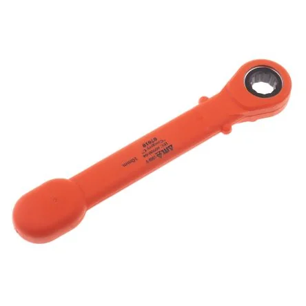 Insulated Ratcheting Ring Spanners. Our range of Totally Insulated Ratcheting Ring Spanners are designed to protect you from up to 1000 V. The 72-tooth ratchet ring and gear produce a 5° rotation allowing it to function in tight spaces. Featuring injection moulded Nylon 11 insulation that bonds with the tool to offer maximum protection and longer life. The unique Nylon 11 insulation makes the tools a great choice when working in intense climates and the most difficult conditions. An excellent choice for both electrical and industrial engineering applications. Features and Benefits Each tool is injection moulded Nylon 11 insulation IEC 60900:2004 specification