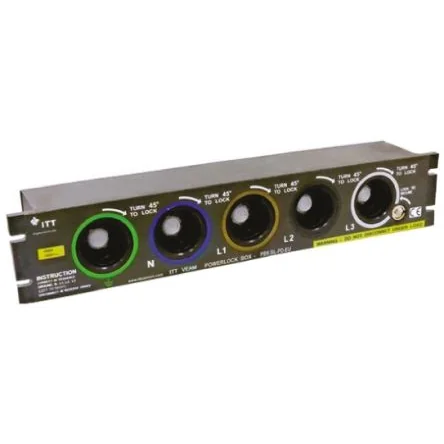 IP67, UL94-V0, IP2X. Never attempt to uncouple a connector when under load. 400 and 600 amp connectors are interconnectable, which is not advisable in a power network, caution must be applied when building a network to ensure the power handling capabilities of connectors are not exceeded. ITT Veam PowerLock Sequential Connecting Box, European Spec. ITT VEAM PowerLock Box is utilised whenever the need to link a generator to a high current low voltage network is required using VEAM powerlock connectors, suitable for indoor or outdoor use. Typical applications for the VEAM PowerLock box include mobile generators utilised at outdoor events, theaters, hospitals and power plant applications amongst others. The ITT VEAM Powerlock box is capable of running 1500 Vdc and with a continuous current of 660 amps and comes in a 19 inch x 2U rack mounting format, utilises standard Powerlock connectors either drain or source with keyed ports to ensure correct interfacing which are lockable to prevent accidental disconnects, coded to suit European 3 phase standards. Keyed ports to prevent incorrect insertion IP2X finger protected Lockable to prevent accidental disconnection 660 Amps continuous current Panel Drain and Panel source options, with or without sealed lid