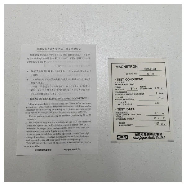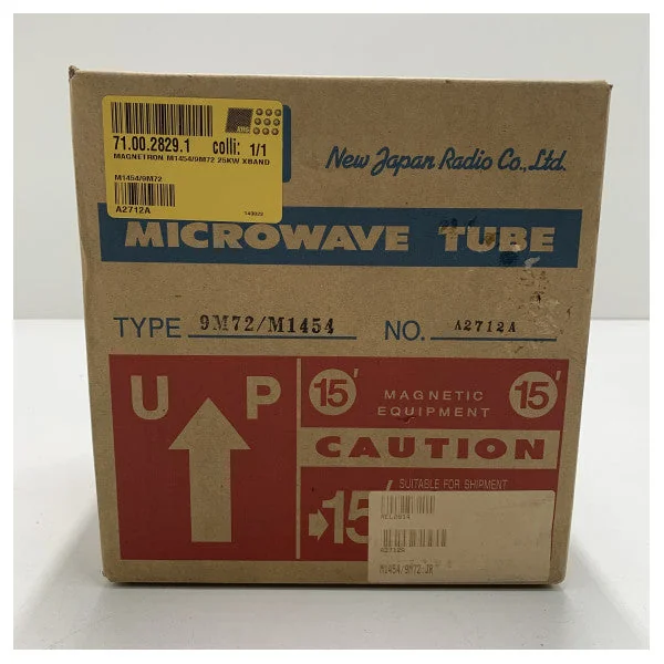 The JRC X-band 25 kW radar magnetron M1454/9M72 is a powerful and reliable magnetron designed for use in maritime and aviation navigation radar. The magnetron has a frequency range of 9380 to 9440 MHz and a peak power of 25 kW.