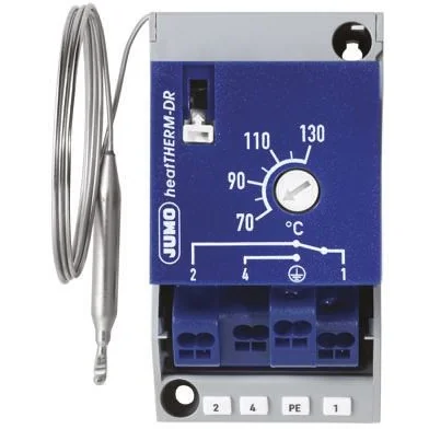 DIN EN 14597. heatTHERM-DR - Safety temperature limiter. Thermostat for top-hat rail assembly Must be unlocked manually if the limit value is exceeded The current circuit remains open if the measuring system is destroyed Capillary length 2000 mm Stable switch point position through ambient temperature compensation Push-in connection technology reduces installation time by 50 % Protection system IP20
