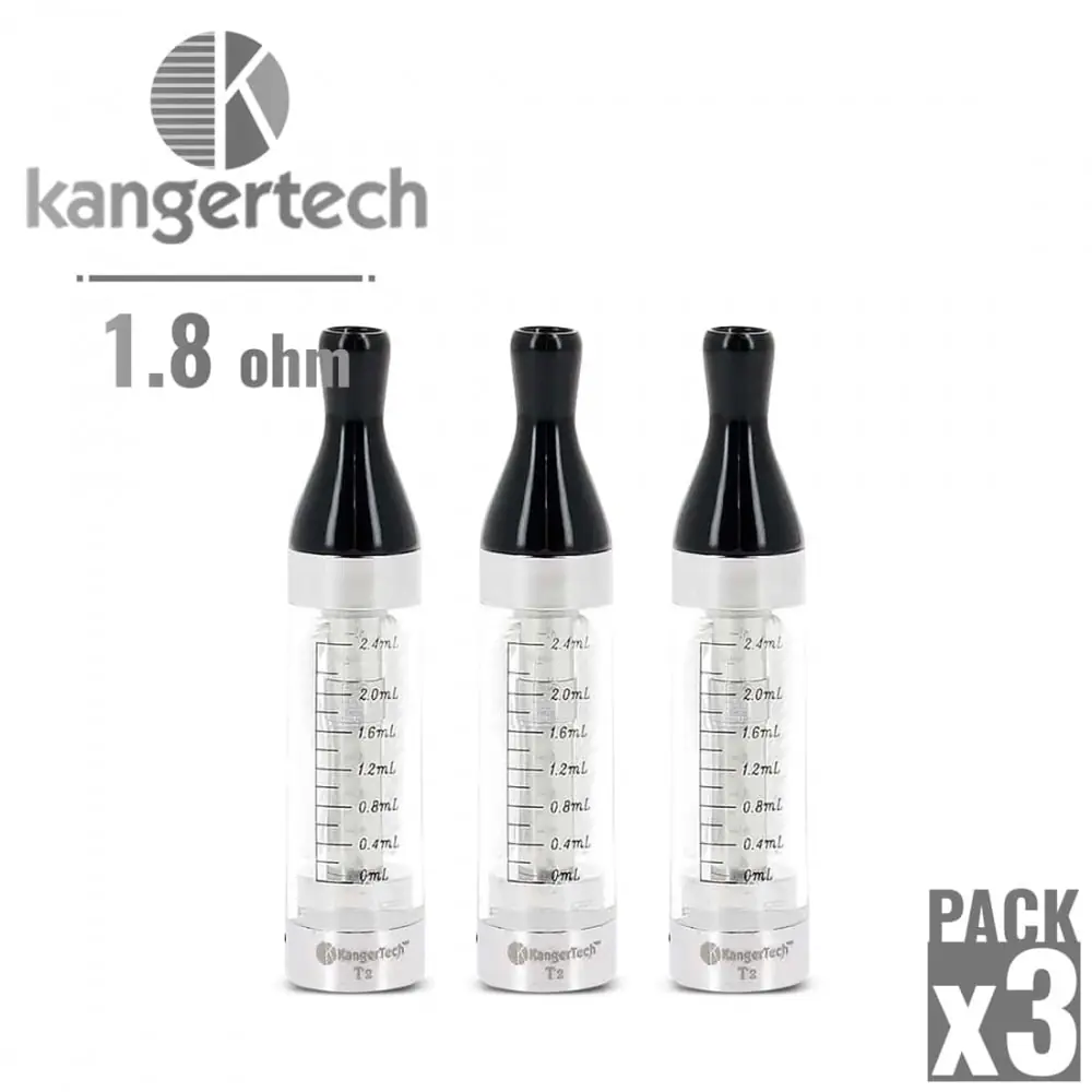 Set of 3 Kangertech T2 clearomizer of 2.4 ml capacity with 1.8 ohm resistance for ego type e-cigarette battery. Very easy to use easy to install and clean.