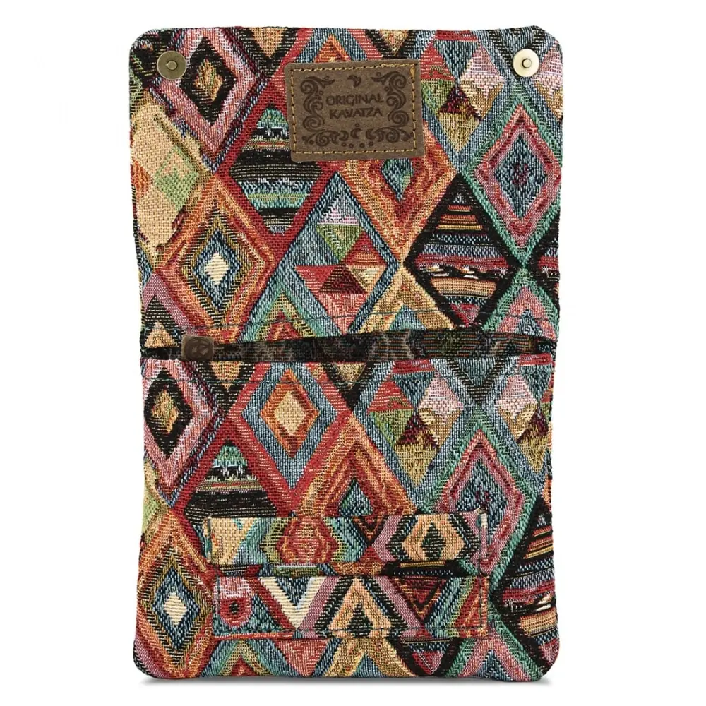 the kavatza cotton diamonds deluxe tobacco pouch is made of colored fabric with snap buttons. it has two inside pockets to store your tobacco and accessories as well as a compartment for a regular rolling paper booklet.