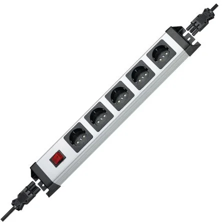 POWERversal 5-way, with illuminated switch (2-pole), sidewise connecting for GST18 plug-in-system, cascadable, with shutter, with 90° turned sockets, 65mm distance between sockets, mountable, reconnectable, 250V~, 16A, max,3600W, colour: silver- black