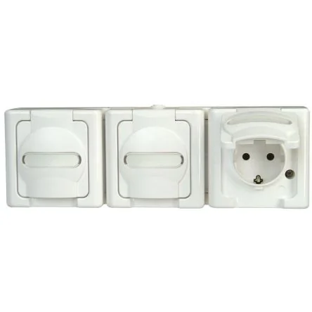 Moisture-proof 3 gang plug socket designed for outdoor use with a hinged cover.