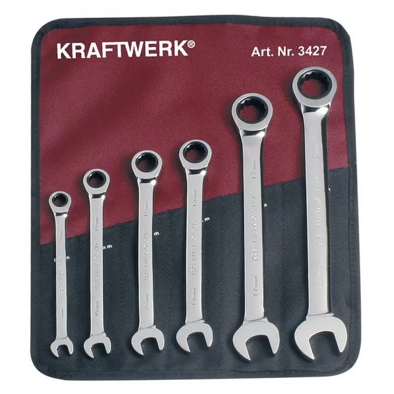 The Kraftwerk 4-pcs. rev. CLICKRAFT set (10-19 mm) is a set of four reversible combination ratchet spanners, each featuring a 72-tooth ratchet mechanism, a switch lever for right and left rotation, a 5° return angle, and a 15° jaw position. These spanners are made of chrome vanadium steel with a bright chrome plated and mirror polished finish. They are supplied in a cardboard box.