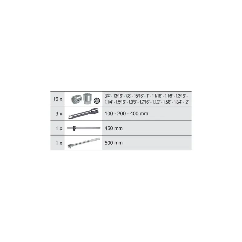 This set is particularly suitable for automotive industrial and gardening applications offering a wide variety of sizes to fit different bolts and nuts. Thanks to its practical storage system each piece is easily accessible allowing for considerable time savings during your work. Moreover the ergonomic design of the accessories ensures optimal comfort of use even during long working sessions.