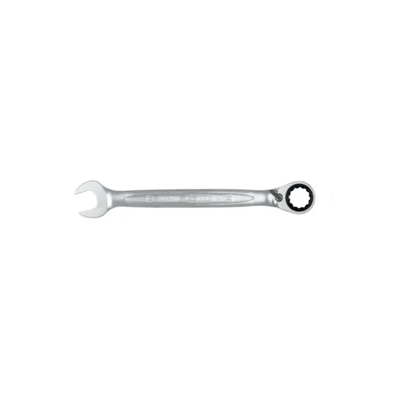 The GearPlus KS TOOLS reversible ratchet combination spanner - 11 mm - 503.4611 features a fork angle of 15° and a 13° angled eye. The 72-tooth reversible ratchet allows you to work with minimal effort during tightening and loosening. With a robust chrome-vanadium design, you will have a sturdy tool that meets DIN 3113 / ISO 3318 / ISO 7738 standards.