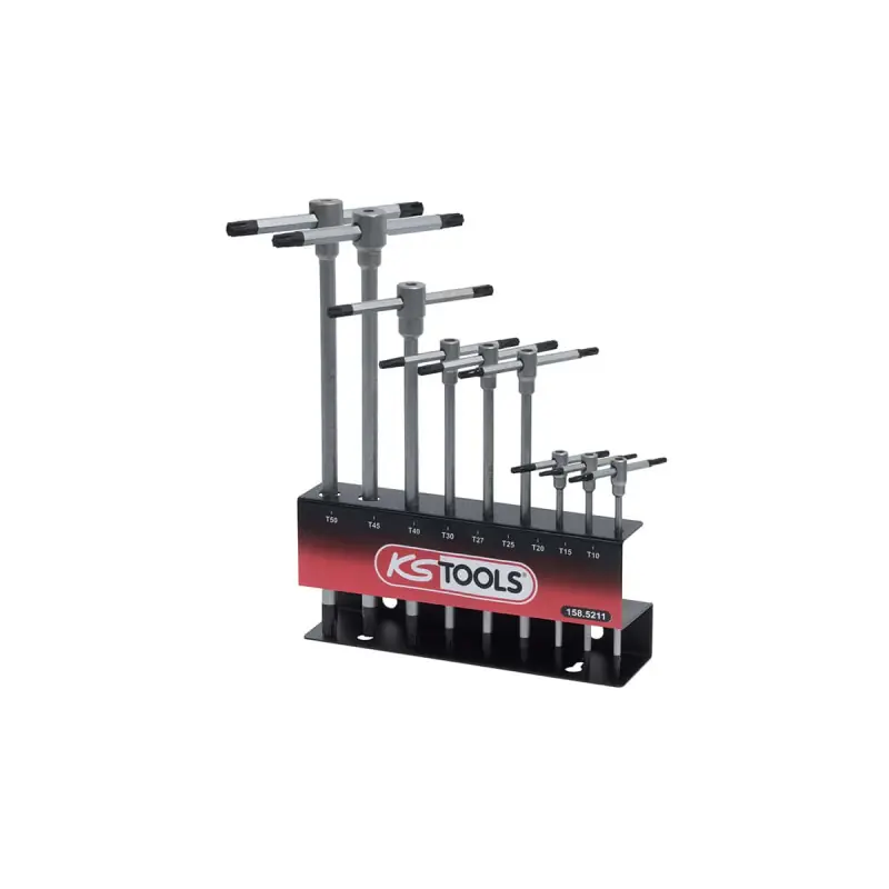 KS TOOLS T-Handle Wrench Set - Metal Display - 9 pcs T-handle male torx wrenches made of chrome vanadium. Features 3 stop positions. Set on display.