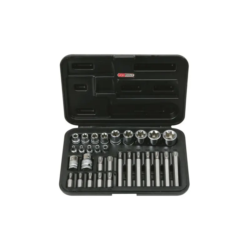 Discover the KS TOOLS TORX socket and screwdriver socket set, a complete 30-piece set designed to meet the needs of DIY enthusiasts and tool professionals. This set is ideal for carrying out precision work on various types of machines and devices thanks to its wide range of sockets compatible with TORX screws. Whether you are assembling furniture, repairing appliances, or doing mechanical work, this versatile kit will allow you to accomplish your tasks with remarkable efficiency.