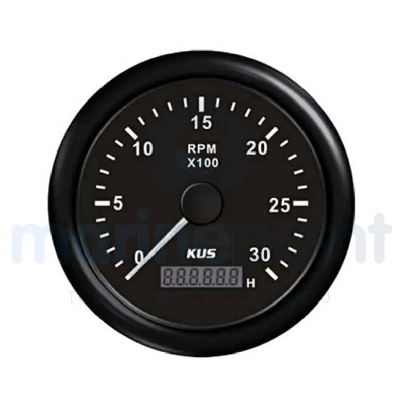 This black-finished KUS tachometer, equipped with an integrated hour meter, is essential for any nautical instrument panel. It allows precise monitoring of revolutions per minute up to 3000 rpm and the engine's total running time, necessary for maintenance and efficient onboard management.