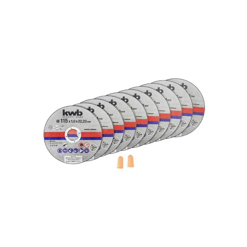 Thepack of 10 extra thin cutting discs KWB - 115 mm - with earplugs is ideal for ensuring you never run out of discs while working with your angle grinder. These accessories can be used with many grinders available on the market, provided they reach up to 13,300 rpm. These discs are made from a synthetic resin-corundum blend and are particularly suitable for cutting stainless steel. Please note that this pack is sold with earplugs to protect you while using your tool.