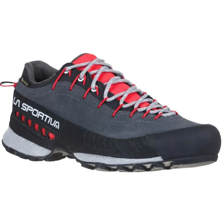 The La Sportiva Women's TX4 GTX Approach Shoes are engineered for durability and comfort during technical approaches and rugged terrains. Featuring a robust leather upper, these shoes are designed to withstand abrasion and the elements. The inclusion of a GORE-TEX Extended Comfort membrane ensures waterproofing while maintaining breathability.