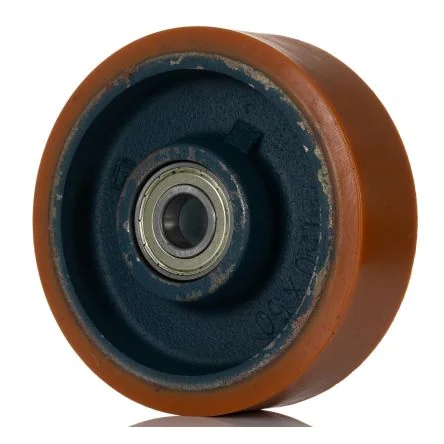 Durable polyurethane trolley wheel designed for heavy loads and smooth operation.
