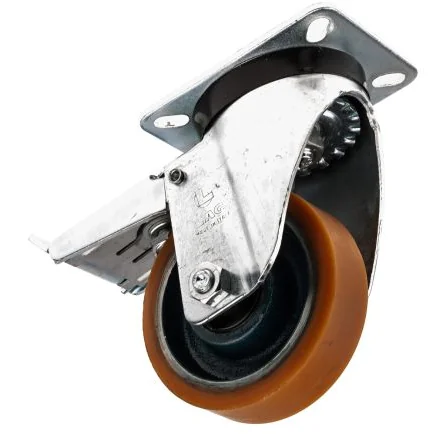 Polyurethane Tyre, Cast Iron Hub, Heavy Duty, Series M40 . Heavy duty castor, white zinc plated, top-plate mounting with a polyurethane tyred cast iron hub. Central king-pin and self-locking nut High resistance to abrasion, tearing, oils, petrol, greases etc Wheels fitted with ball bearings Temperature range -30°C to +80°C Hardness 95+/-3 Shore A Wheel series Z