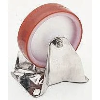 Polyurethane Injection Tyre, Nylon Hub, Medium Duty, Series INOX 20 . Plate Fixing castors. Quiet and easy running under heavy loads. Resistant to corrosion, abrasion and shocks. Manufactured from hygienic materials. Nylon 6 wheel with polyurethane tyre Tyre hardness 58±3 Shore D Plain bore hub bearing Swivel types have stainless steel ball bearings Operating Temperature -30°C to +80°C Wheel series N Stainless steel fork material