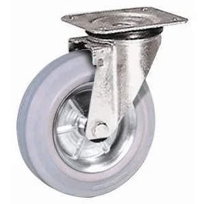Grey Rubber Tyre, RoHS, Medium Duty, Series M22 - Plate Mounted. Grey non-marking rubber tyre, press steel; electro-zinc plated, white RoHS compliant Double ball race swivel head castor Temperature range -20°C to +60°C Hardness 85+/-5 Shore A Wheel series B/G