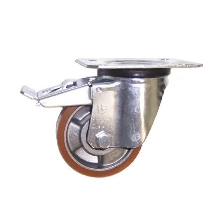 Wheels with cast polyurethane coating 95 Sh.A on aluminium hub. Available with ball or roller bearings. M22 series, Medium-light pressed steel fork assemblies, swivel version has double ball raceways, Zincplated.