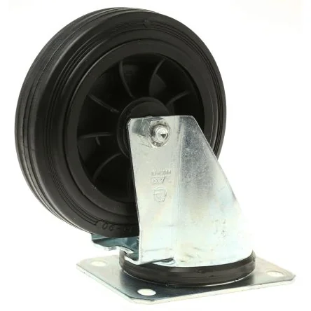 Black Rubber Tyre, RoHS, Black Nylon Hub, Medium Duty, Series M22. Black rubber tyre, plastic hub; electro-zinc plated castor, white RoHS compliant Suitable for use on medium to poor surfaces Fitted with PA6 plain bearings Double ball race swivel head castor Temperature range -20°C to +60°C Hardness 85+/-5 Shore A Wheel series D