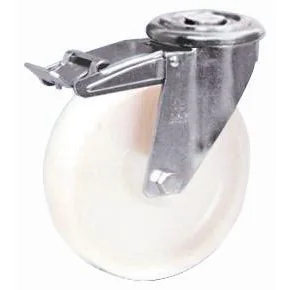 Nylon Polyamide Wheel, RoHS Steel Fork, Medium Duty, Series M22 - Single Bolt Hole Mount. Swivel forks are electro-zinc plated, white RoHS compliant, bolt-hole mounting Low rolling resistance, excellent resistance to shock, abrasion and corrosion Easy to clean Double ball race swivel head castor Temperature range -30°C to +80°C Wheels with plain bearings Wheel series P