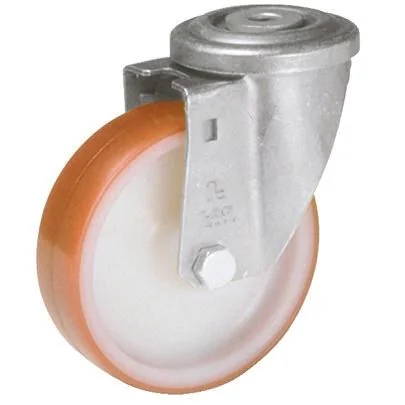 Polyurethane Injection Moulded Tyre, Nylon Hub, Medium Duty, Series M22. Single bolt hole mount Orange polyurethane injection moulded tyre Electro-ainc plated white passivate pressed steel forks RoHS compliant Excellent smooth and silent running; high abrasion and corrosion resistance Shock absorbent Hardness 58 ±3, Shore D Wheel series N