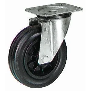 Black Rubber Tyre, RoHS, Black Nylon Hub, Medium Duty, Series M22. Black rubber tyre, plastic hub; electro-zinc plated castor, white RoHS compliant Suitable for use on medium to poor surfaces Fitted with PA6 plain bearings Double ball race swivel head castor Temperature range -20°C to +60°C Hardness 85+/-5 Shore A Wheel series D
