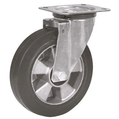 Black Elastic Rubber Tyre, Aluminium Hub, Medium Duty, Series M22. Plate mounted Black elastic rubber tyre, non-marking; electro zinc-plated white passivate pressed steel forks RoHS compliant Smooth and silent running with high abrasion resistance Roller hub bearing Hardness: 73 ±5, Shore A Wheel series E