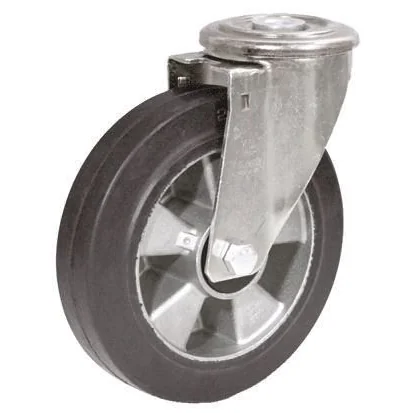 Black Rubber Tyre, Steel Hub, Medium Duty, Series M22 - Single Bolt Hole. Single bolt hole fixing Solid black rubber tyre; electro-zinc plated and white passivate finish pressed steel frame RoHS compliant Suitable for use on medium to poor surfaces Roller hub bearing Hardness: 85 ±5, Shore A Wheel series B + E