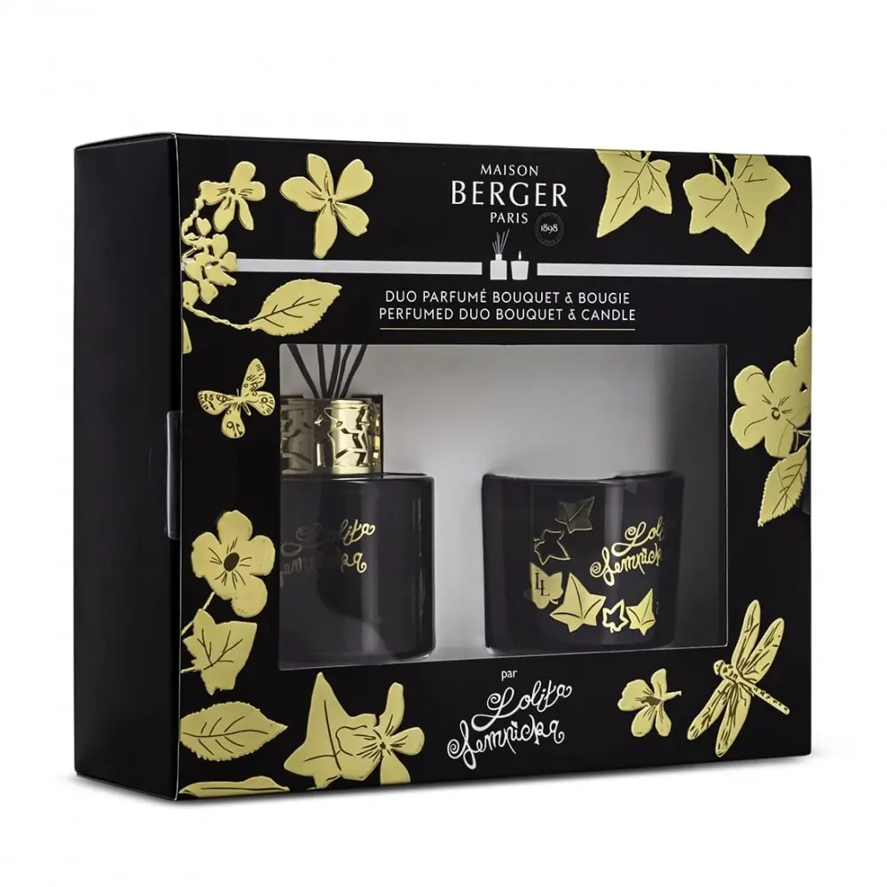find a scented candle and a fragrant bouquet inside the lolita lempicka scented duo box. a magnificent box highlighted by beautiful gold and black colors and signed by an alliance of major entities in the field of perfumery.