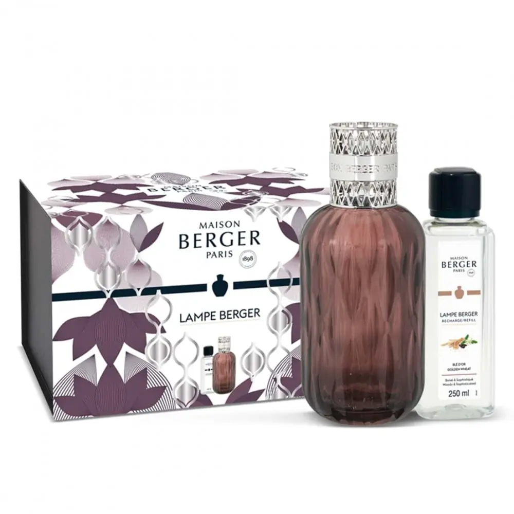 sleek and refined the lampe berger quintessence prune comes in a box with the 250 ml blé d'or fragrance. an elegant duo to purify and perfume your home while decorating your space.
