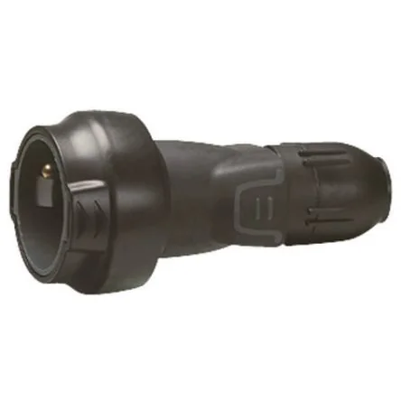 2P+T rubber extensions and plugs. Quick-connect plugs and extension cables with automatic terminals and cable gland cable clamp. Strong cable clamp for sealing and clamping without tools (resistance strength of the cable clamp: 30 kg at 2.5 mm²). IP44. Cable H07RNF 3G 2.5 mm² maximum.