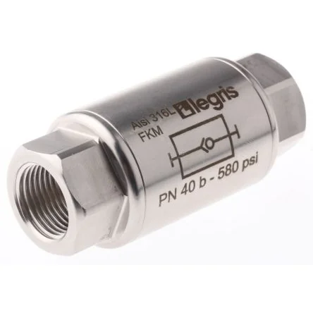 Parker Legris Non-return Valves - Uni-directional Female x Female, BSP. Legris stainless steel non-return valves allow fluids to pass in one direction whilst blocking flow in the other direction. Robust and extremely compact, they are suitable for use as a safety item in all fluids circuits. They are ideal for use in severe conditions and in aggressive environments. Operation: A stainless steel valve blocks the fluid passage, when the pressure differential is lower than 0.25 bar. Available in 3 sizes to choose from:. 1/4" BSP Parallel Female - ; 458-6788 458-6788. 3/8" BSP Parallel Female - ; 458-6794 458-6794. 1/2" BSP Parallel Female - ; 458-6801 458-6801. Features and Benefits:. Permits flow in one direction only. Body and shut-off valve in stainless steel 316L. Spring in stainless steel 302. ‘O ‘-rings fluorelastomer FKM (FPM). Maximum working pressure 40 bar. Temperature range -20°C to +180°C