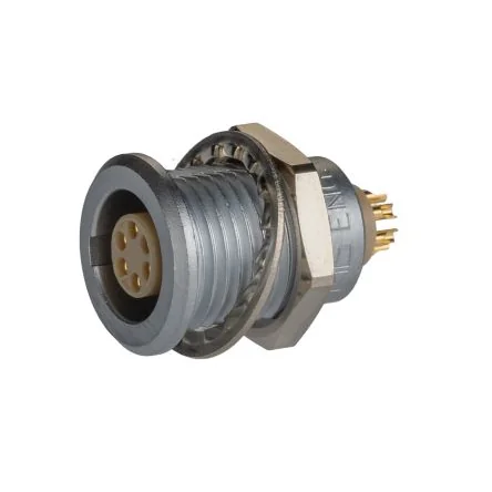 Reliable LEMO circular connector with 6 contacts, designed for easy panel mounting.