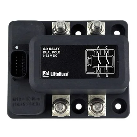 SD Series High-Amp Relay, Remote Disconnect Switching. The SD series relay gives the option of an all-vehicle remote disconnect switch. It is ideally suited for applications with continuous high-current, large engine starting needs or high ambient temperatures. It utilises small control cables for operation eliminating the need to run heavy, expensive copper cables to the operator. This dual pole item enables switching of two circuits, positive and negative or 12 V and 24 V. It is SAE J1171 ignition protected and ISO 8846 rated for instillation in a battery box or on vehicles carrying hazardous loads. It also has a dedicated 24-hour output for tachograph and other keep-alive functions. Features and Benefits. Auxiliary Relay contacts (NO ; NC) for Alternator Field Disconnect (AFD) or for additional vehicle system control Supports multiple E-stop Off switch control applications Uses small control wires for operation Bi-stable internal mechanism draws no current in On or Off state Ingress rating: IP66/IP69K Operating temperature range: -50°C to +125°C