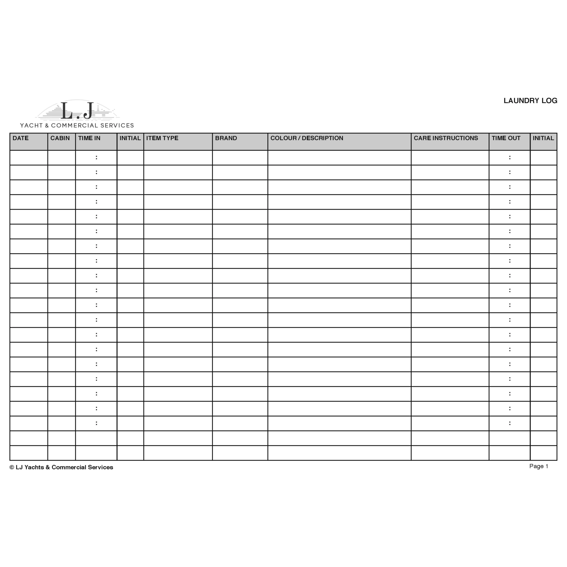 A laundry logbook is used to record garment care procedures, linen wash cycles, stain treatments, drying methods, and inventory tracking to ensure consistent service and accurate documentation of laundry operations onboard.