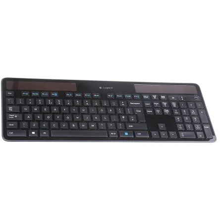 Keyboard Logitech Unifying receiver Wireless extender Cleaning cloth 3-year manufacturer ‘s guarantee and full product support User documentation printed on the inside of the box. Logitech® Wireless Solar Keyboard K750 (UK). The solar-powered Logitech® Wireless Solar Keyboard K750 charges itself whenever there ‘s light, so you can say goodbye to batteries, and charging cables. With sleek lines and a thin profile, this stylish, streamlined keyboard adds style to your workspace. Combining the best of traditional keyboards, laptops and a Logitech-only concave key cap design. Logitech Unifying receiver stays in your laptop, so there's no need to unplug it when you move around. Powered by light Sleek, minimalist design - only 7.5 mm thick Feel-good typing Wireless range 10m Logitech® Advanced 2.4 GHz wireless connectivity Logitech® Unifying receiver. System requirements:. Windows® XP, Windows Vista® or Windows® 7 Light source from sunlight and/or indoor lighting