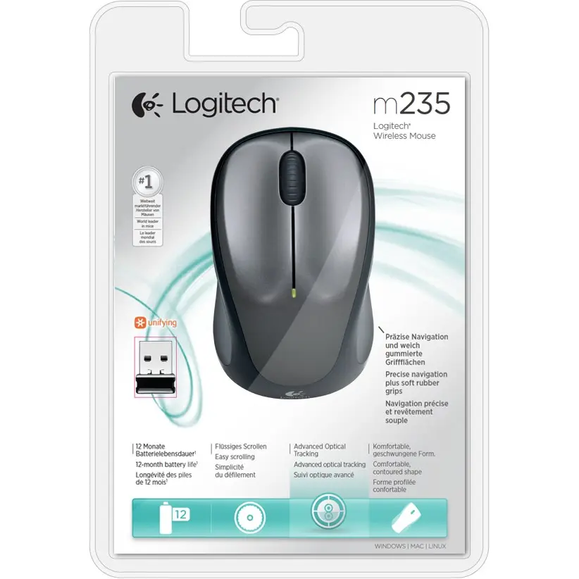 Logitech® Wireless Mouse M235. The feel-good, reliable mouse that’s a smooth traveller. You can surf the Web with more comfort and ease—thanks to the contoured design with soft rubber grips. And your mouse is easy to slip into a bag when you want to take it with you. You’ll enjoy smooth cursor control, precise tracking and easy text selection on the surfaces where you use your computer most. The tiny Unifying receiver connects up to six Unifying-compatible devices with a powerful, reliable wireless connection (up to 25 metres). You can go a full year without battery hassles.* And, you get a 3-year manufacturer's guarantee. * Battery life may vary based on user and computing conditions.