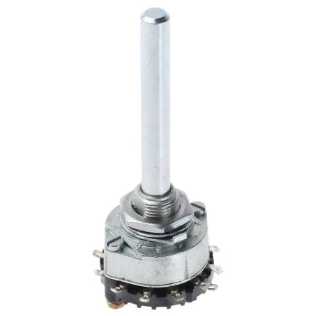 Compact 12 position rotary switch ideal for panel mounting with solder terminals.