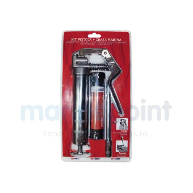 The kit includes a compact and manageable grease gun, ideal for maintenance tasks on vessels. Its design allows use of the connector tube in front or top position according to access needs and offers a maximum pressure of up to 300 k/cm (approx. 300 bar), ensuring effective lubrication even in the most demanding points.