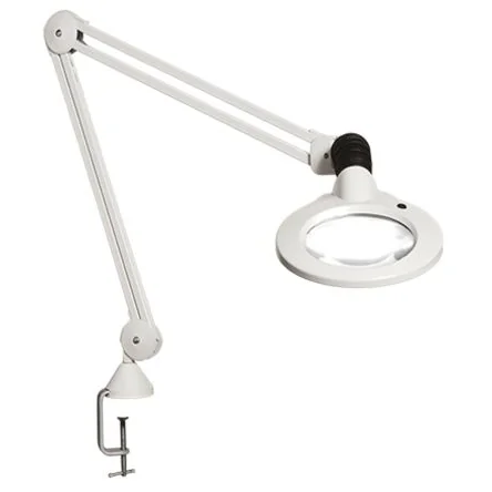 Luxo LED Magnifier LampThe Luxo KFM LED magnifier lamp has a maximum reach of 1050mm and is of table clamp mount magnifier type. It has a professional industrial magnifier that has benefits like strong, all-metal construction, a flexible arm and sleek design. The KFM LED range will give you 11W of power for more than 25 years of normal use.Features and Benefits3 dioptre magnification Aluminium shade Auto shut OFF Cable length is 2m Colour temperature is 4000°K Dimmable from 0% to 100% Two 11W LED dimmable modules Operating voltage rating is 230VAC Lens size is 127mm Fitted with a table clamp Flexible spring of 105cm is used to balance 3 pivot arm with no drift Steel arm Plug type is type C - European plug, type G - British 3-pinApplicationsBeauty salons Clinics Labs