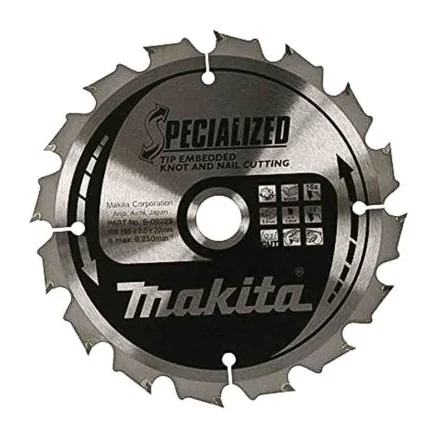 Designed to fit both Makita and other manufacturer’s saws, tip embedded or “;Deep Tooth”; blades are especially tough and hard wearing. Easily copes with knotty wood and will normally slice through nail and screw embedded timber without damaging teeth. Especially suitable for reclaimed timber and demolition work. FOR SANDWICH PANEL FOR CONSTRUCTION.Nail and Knot Cutting. Extremely tough and hard wearing. Extended service life and productivity. OR METAL CUTTING FOR MDF