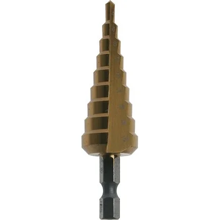 Conical profile step drill bit allows multiple hole sizes to be produced from a single bit. Recommended for softer or thinner materials. Suitable for enlarging existing holes.Ideal for use on Ferrous and Non-Ferrous metals and sheet metal. TiN coated.