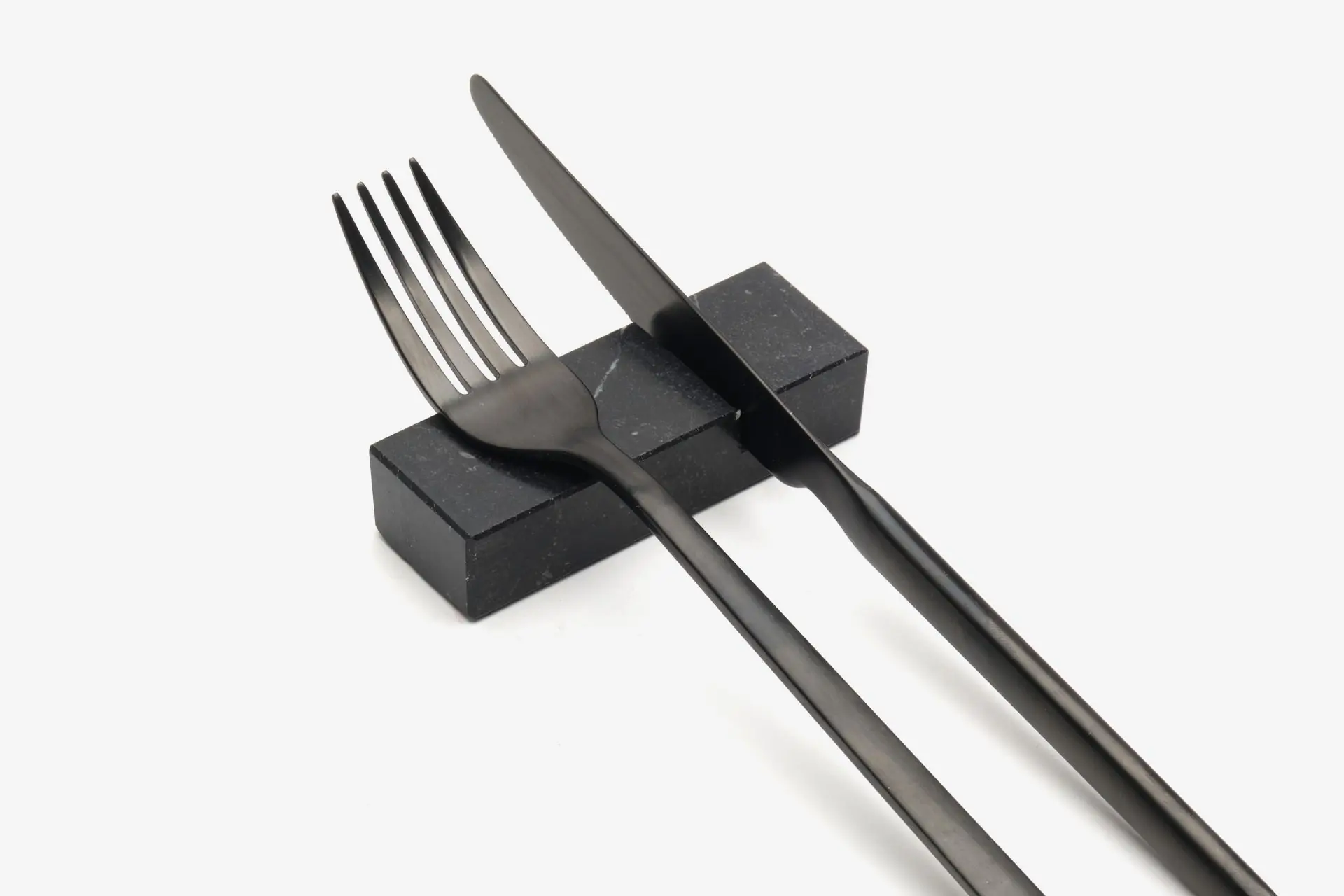 These unique black marble cutlery rests feature a knife cut and are crafted by artisans for a luxurious dining experience.